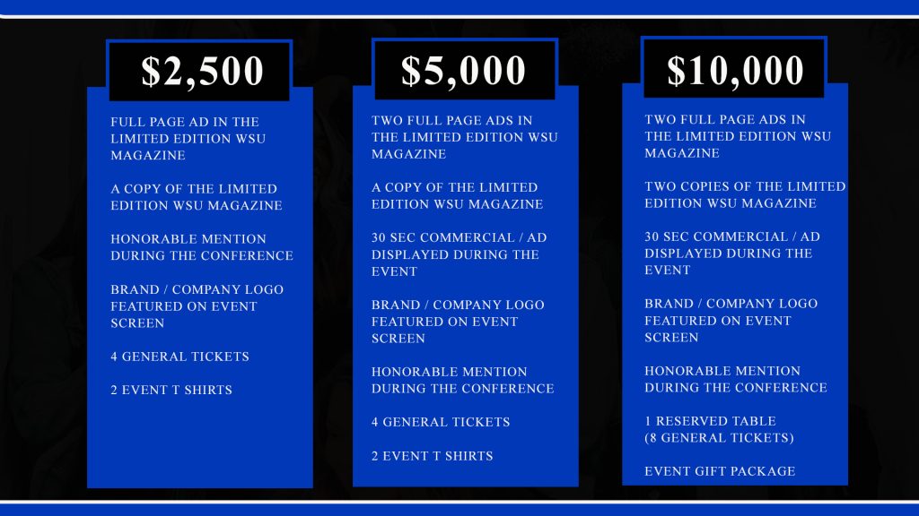 We invite you to explore our sponsorship packages and join us in making a global impact in the lives of others. This is your opportunity to align your Company or Brand with an inspiring event that reaches men and women from across the country.